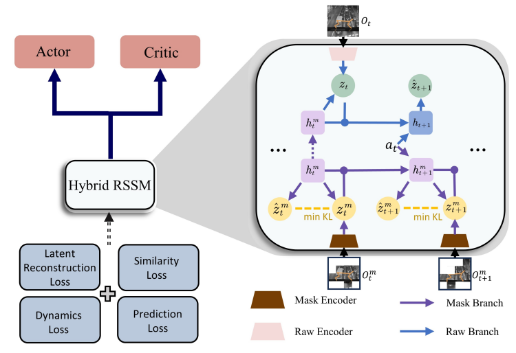In the cooperation of our lab and DreamFold AI, we designed a novel Visual Model-Based Reinforcement Learning (MBRL) approach to address the issue of non-essential noise in pixel-based observations by applying a spatio-temporal masking strategy and a bisimulation principle, enabling the world model to effectively capture endogenous, task-specific features. Furthermore, we developed a Hybrid Recurrent State-Space Model (HRSSM) structure to enhance state representation robustness, resolving instabilities commonly encountered during the...